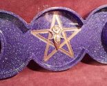 Triple Moon Goddess small resin tray. An antique brass Goddess is applied to an antique bronze Pentacle. Nice for holding change, keys, bits of odds and ends. So nice with the dreamy purple and bronze effect. Cool and elegant. This Tray is approx 6" x 3"