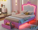 Product Name:Twin Size Upholstered Bed Frame with LED Lights, Modern Upholstered Princess Bed with Crown Headboard, a Drawer, Pink+White