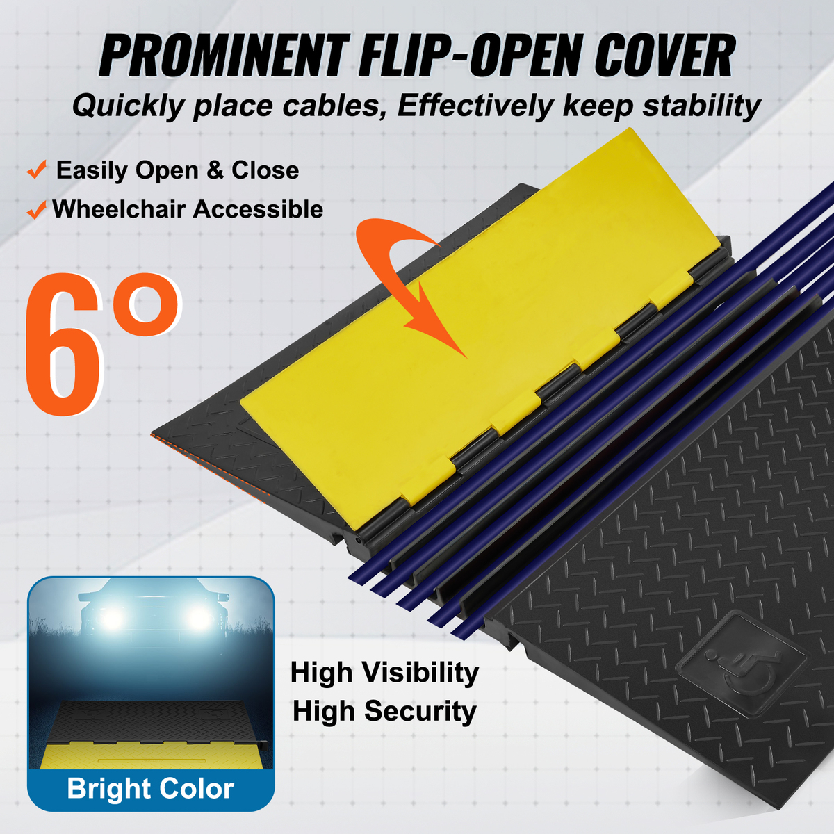 High Convenience Flawless Security: ADA compliant, allows wheels carts to roll over with ease, and everyone can pass by securely. The flip-open top cover design makes the wire cover ramp quick to place and makes removing cables easier than ever. It features eye-catching yellow to enhance the passers-byโs security. The anti-slip texture increases stability.