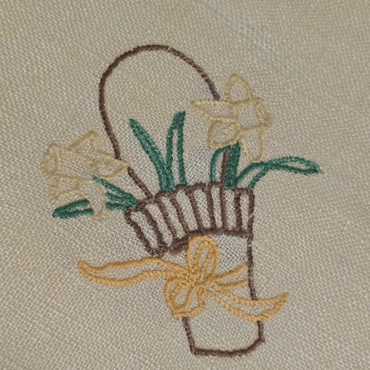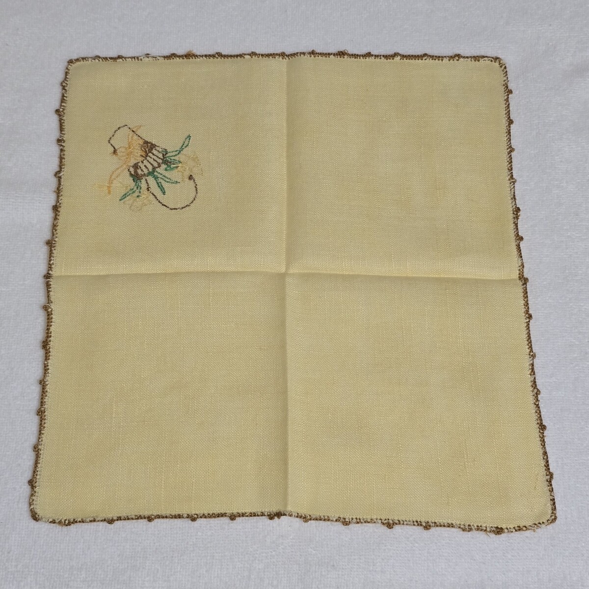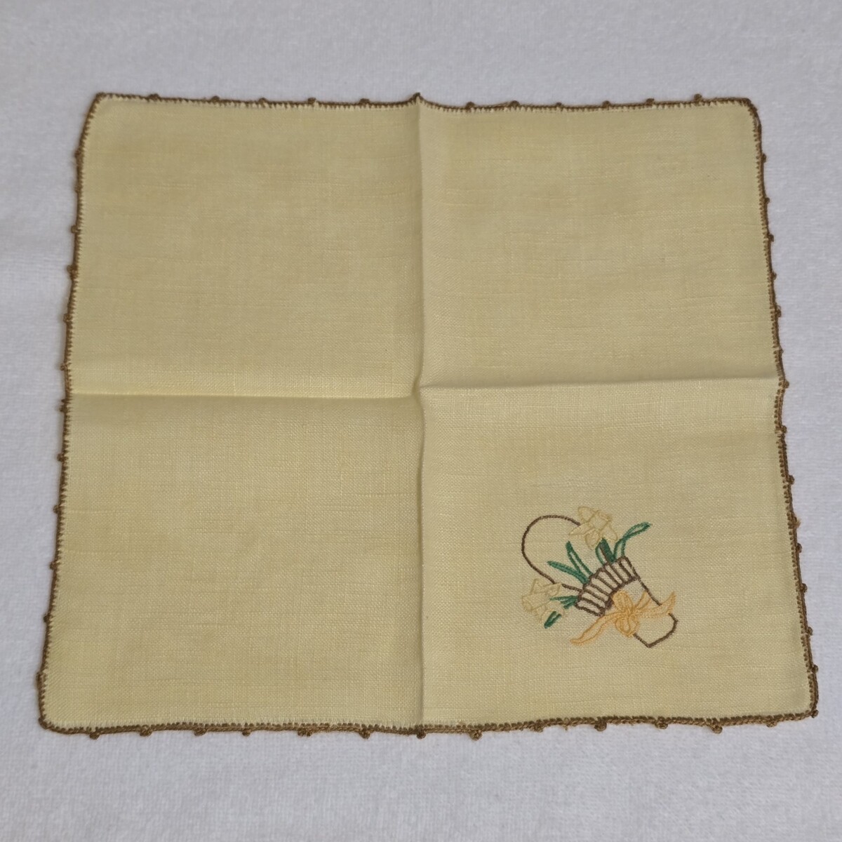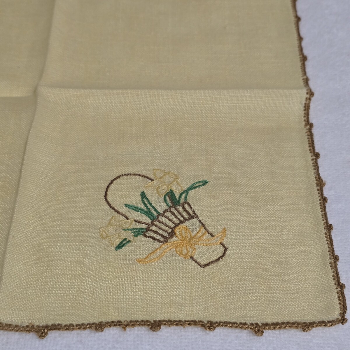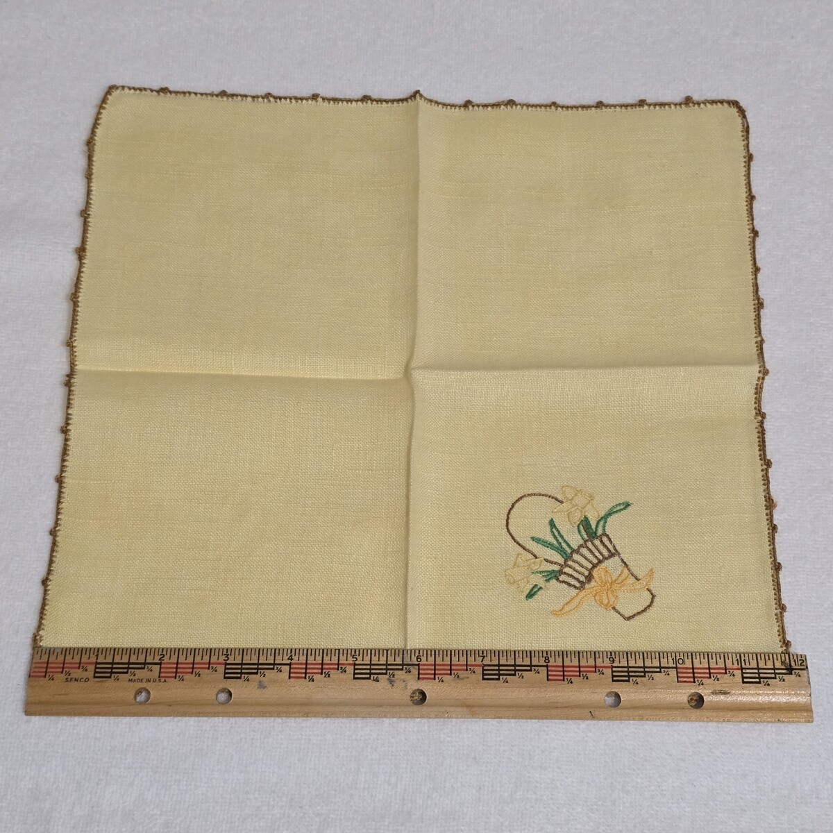 Vintage set of 4 hand-embroidered linen napkins Soft yellow linen with brown crocheted trim edges Each features an embroidered basket of yellow flowers with green stems Approximate size: 11" 11.75" Lovely handmade mid-century cottagecore style Perfect for vintage dining, spring decor, or display ***Very good vintage condition with light signs of age and a few faint storage creases. Please see photos.*** SMOKE FREE HOME! SUPER FAST SHIPPING! BIN 1