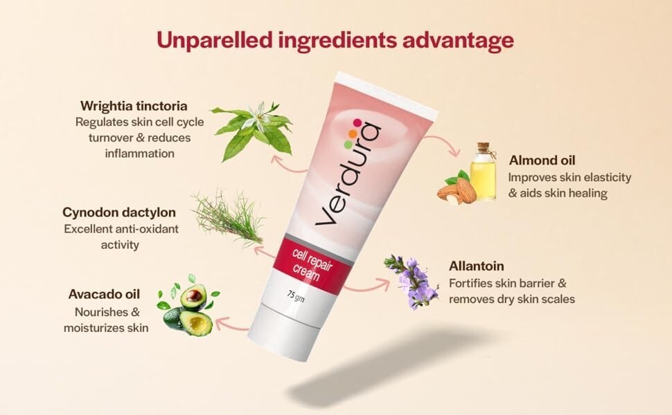Please refer to the individual product packaging for full ingredient lists and detailed usage instructions for both Verdura Cell Repair Cream and Verdura Mela Gain Cream.