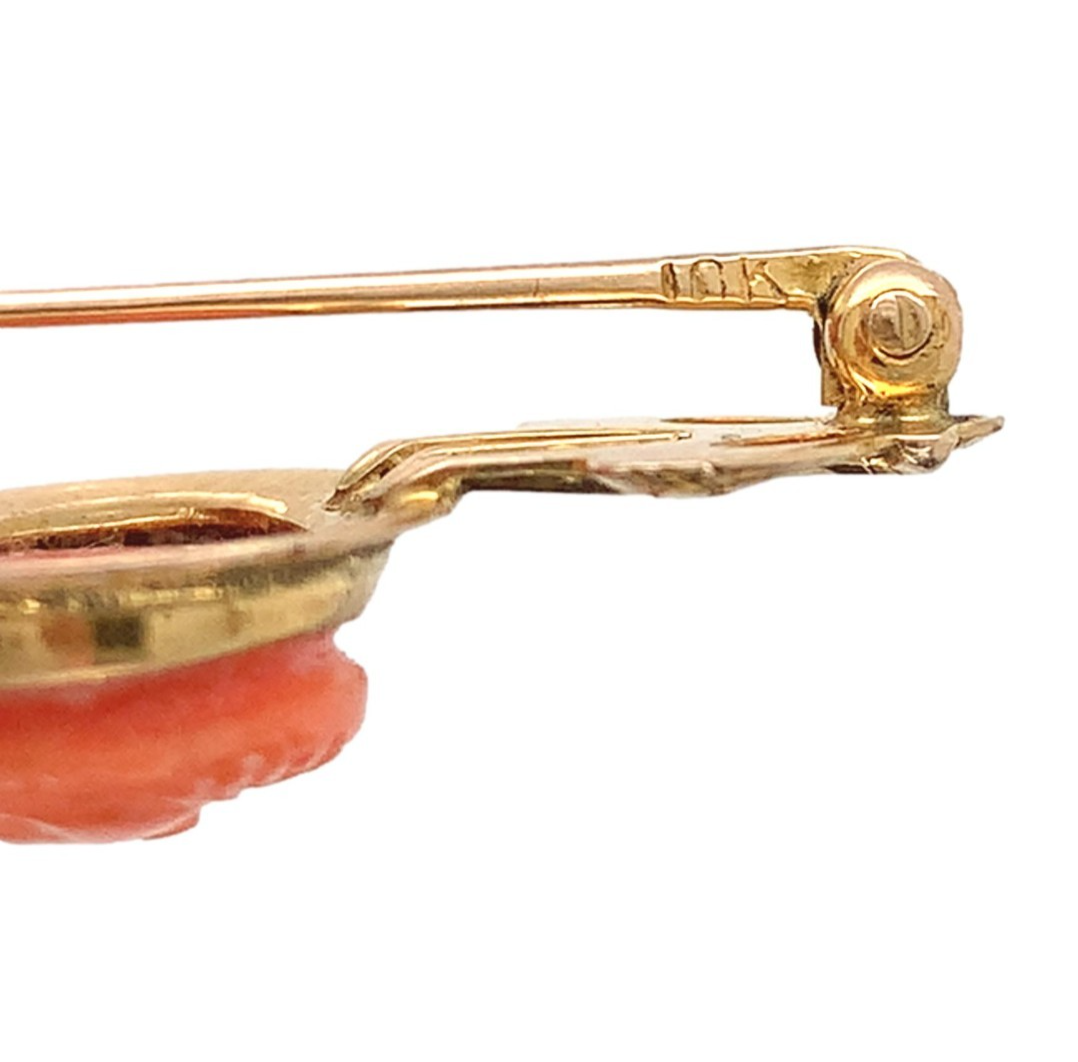 Victorian 10k yellow gold pin featuring a natural coral cameo. The oval cameo features a woman's profile and measures about 12mm x 9mm. The setting is hand engraved and pierced. The pin measures just over 1 1/4" long by 5/8" wide, weighs 1.65 dwt., and dates from the 1890s. Beautiful!