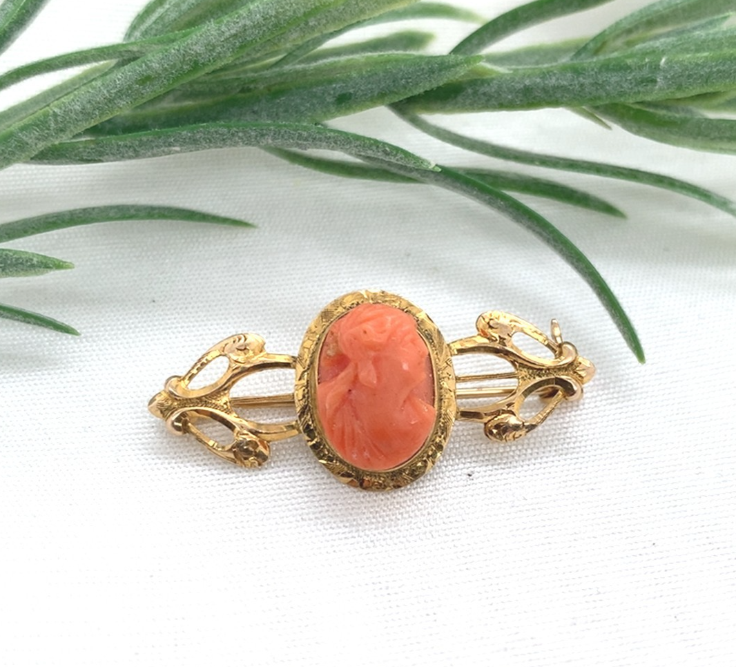 - Victorian 10k Yellow Gold Genuine Natural Coral Cameo Bar Pin Jewelry (#J7341)