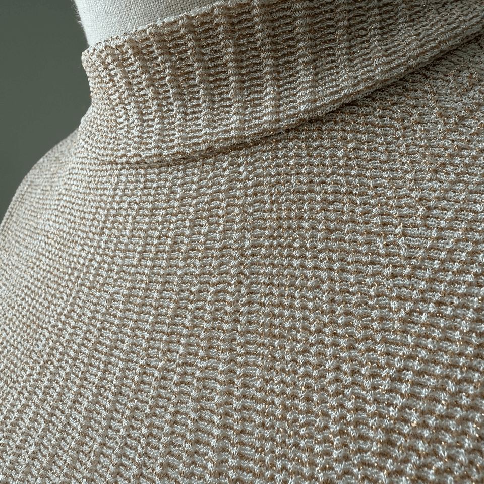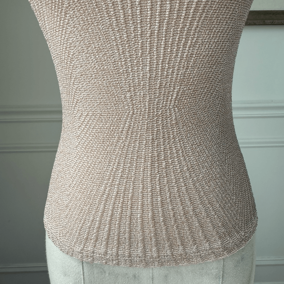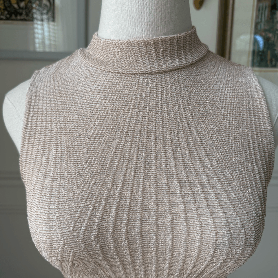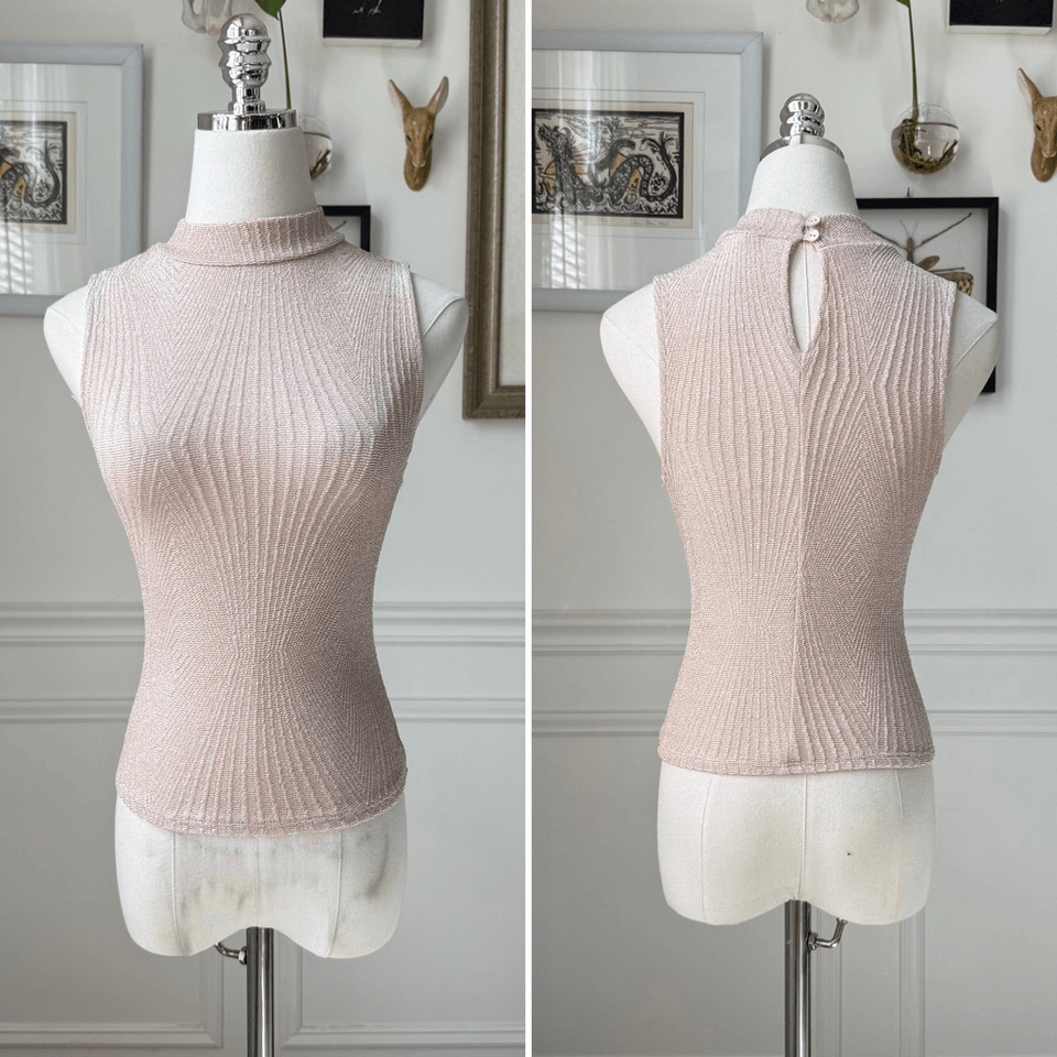 Vintage 90s Contempo casuals, champagne, beige sleeveless, mock neck, crop top with keyhole, opening in the back and flattering our glass ribbing. The color is light beige nude with a subtle champagne metallic shimmer to it. Laying flat measures 19.25 inches shoulder to hem and 13 inches armpit to armpit. Fabric has a fair amount of stretch. Nylon, acetate, metal and spandex blend. Made in the USA.