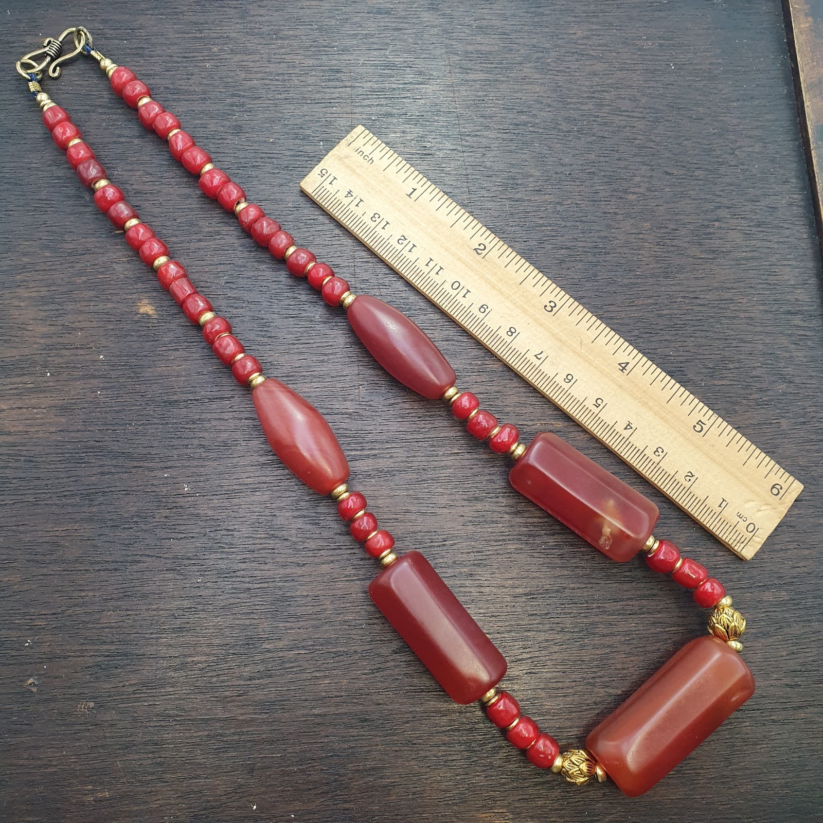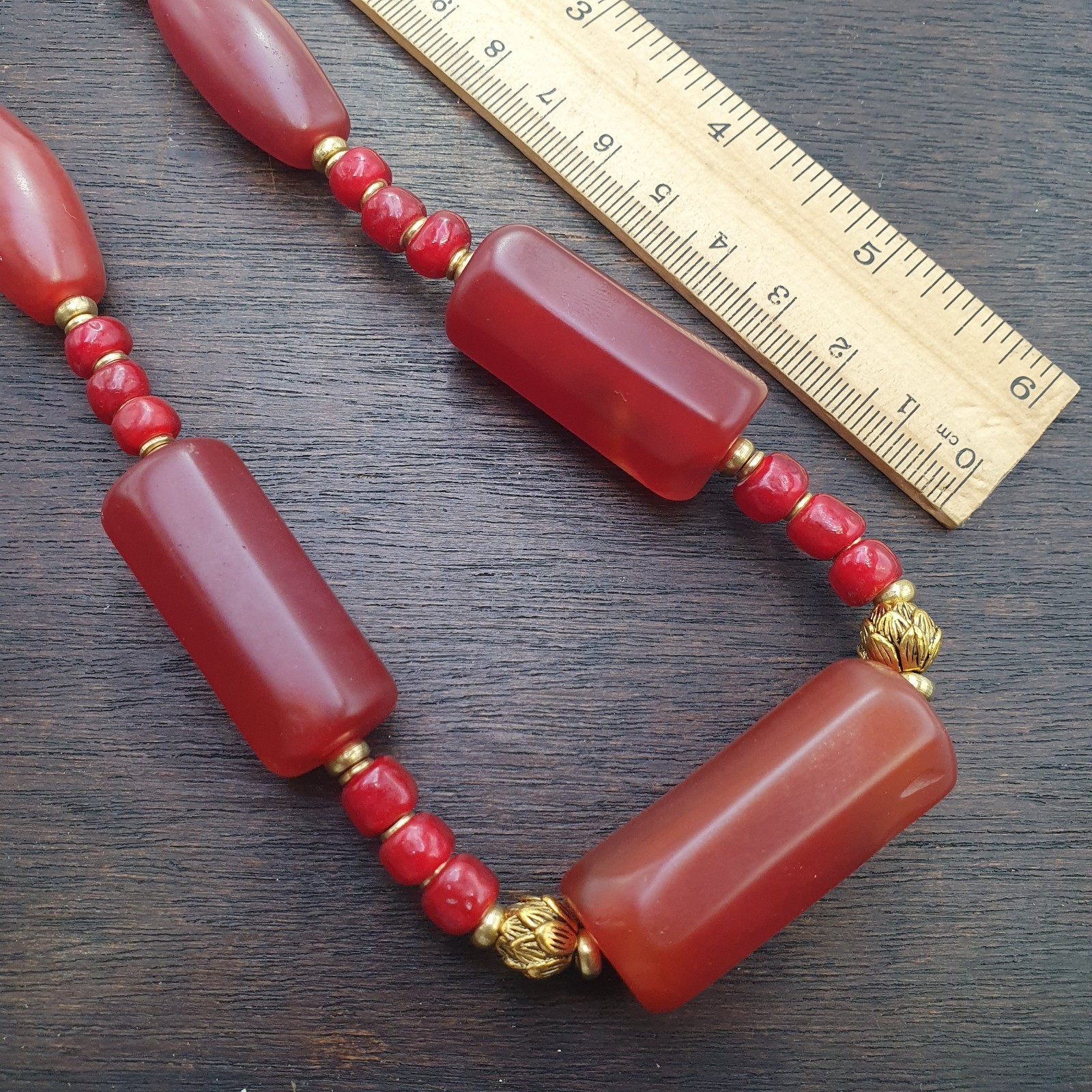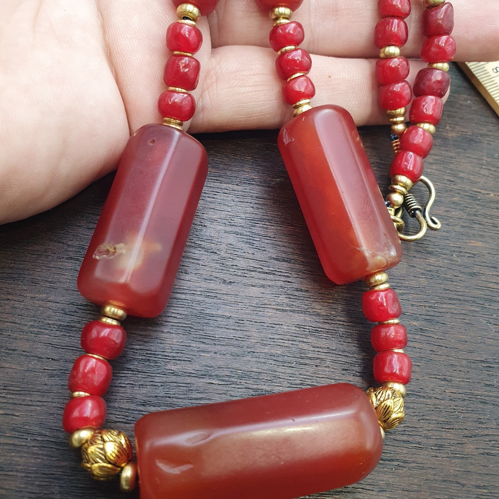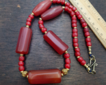- Vintage Himalayan Huge Tube Red Agate and red white heart Beads Necklace