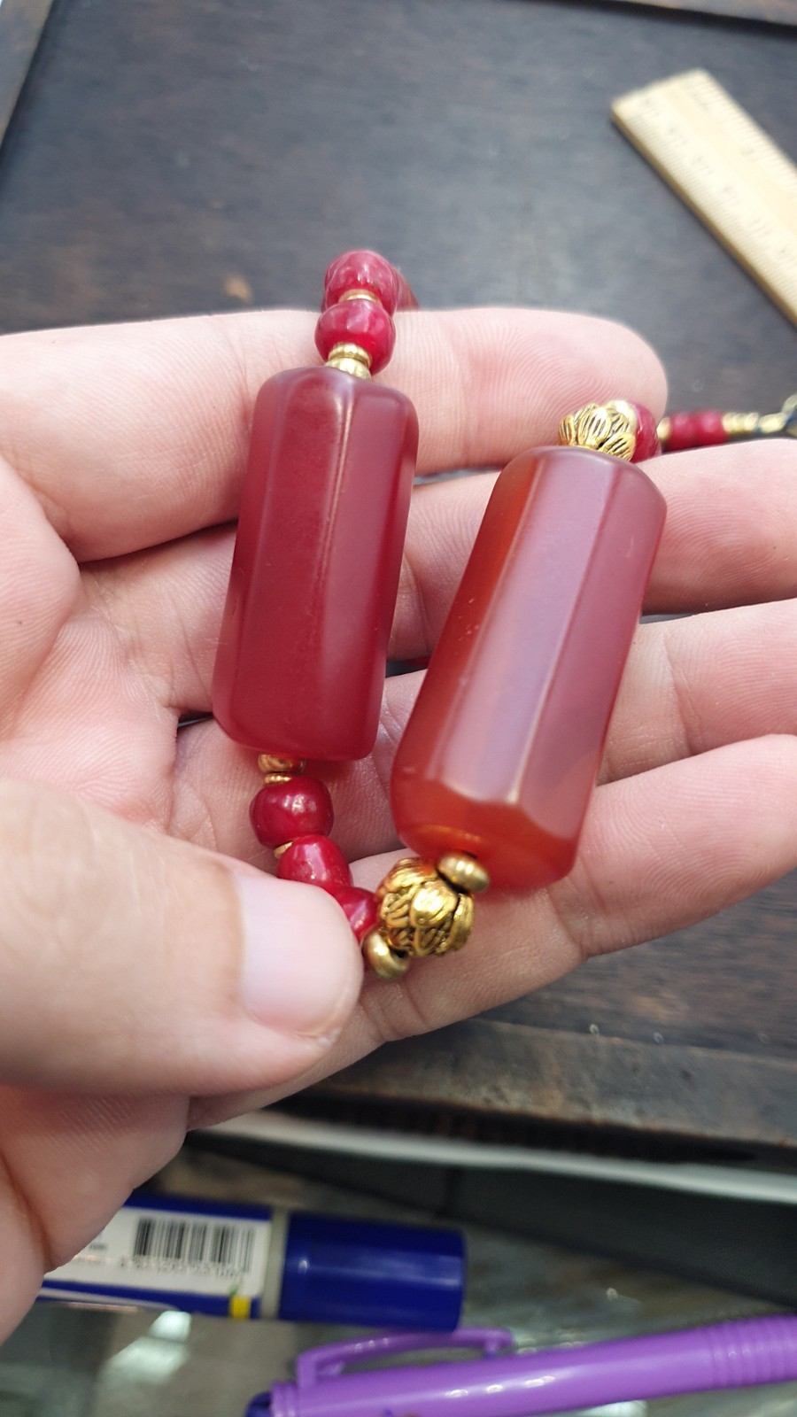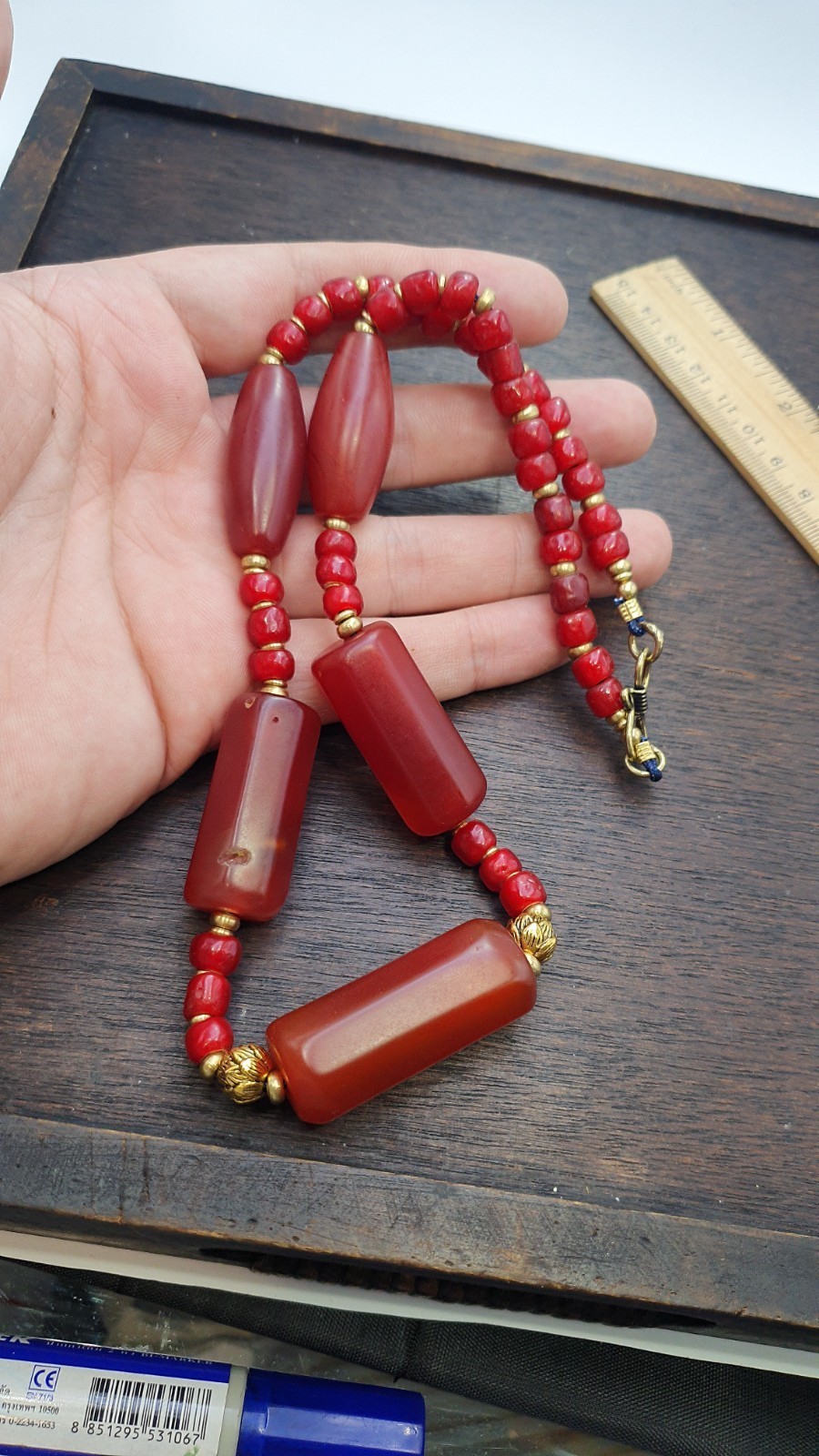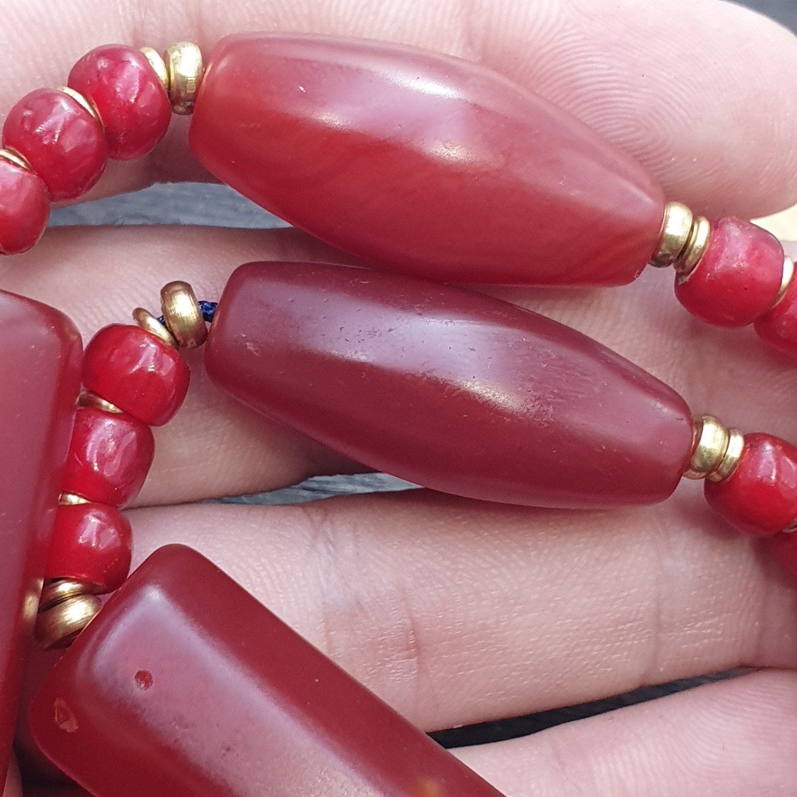 - Vintage Himalayan Huge Tube Red Agate and red white heart Beads Necklace