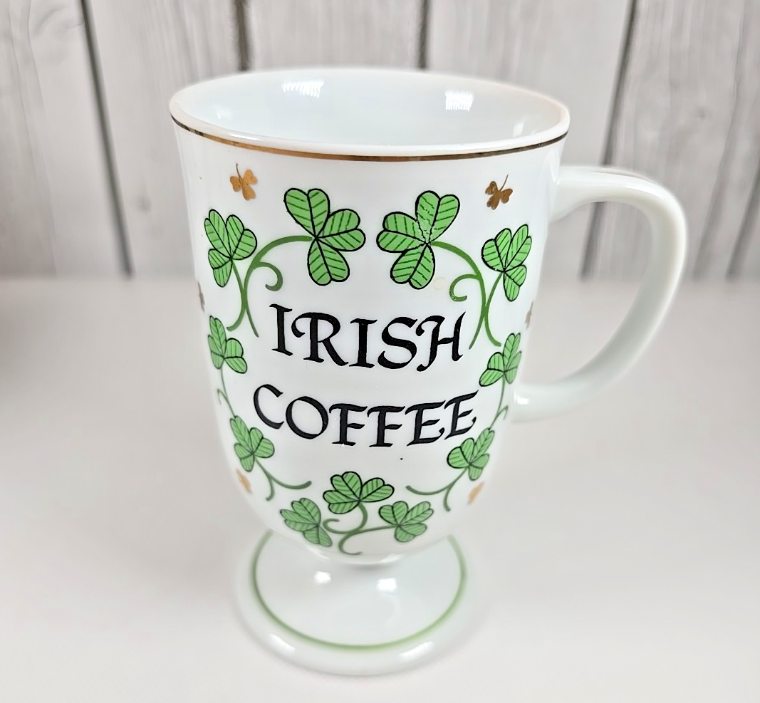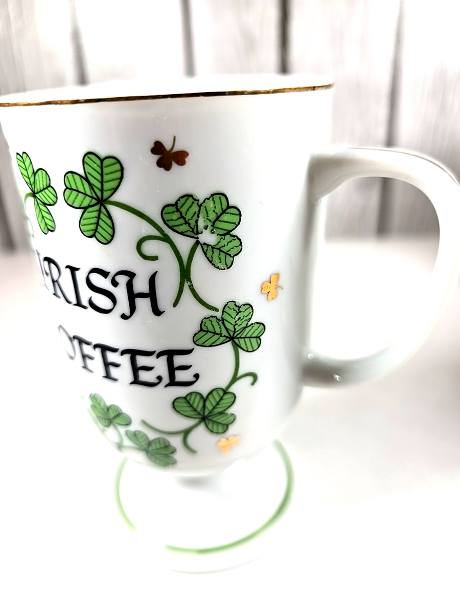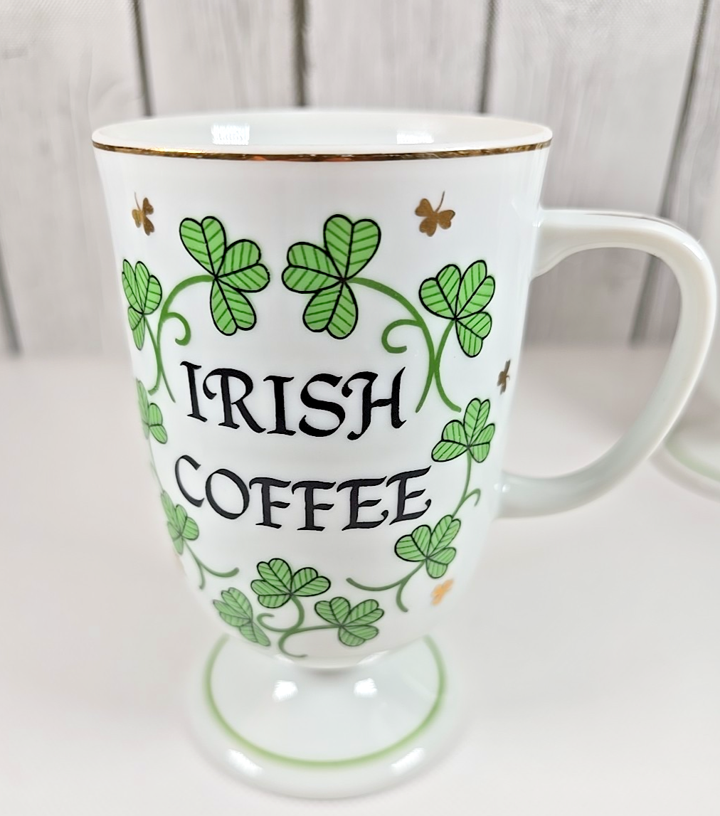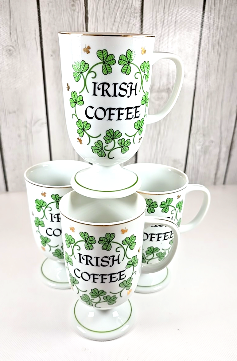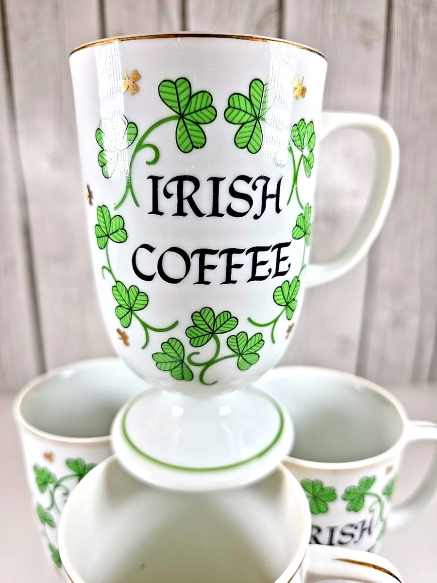 Celebrate timeless Irish charm with this set of 4 vintage 8?oz footed mugs?each adorned with delicate gold trim and shamrock accents, perfect for cozy cafe moments or festive holiday displays. Crafted with elegance and nostalgia, these mugs add a touch of Emerald Isle flair to your coffee hour. ? Four 8?oz footed Irish coffee mugs with gold-rimmed handles and base ? Shamrock motif adds classic St.?Patrick?s charm?ideal for themed gatherings ? Durable glass ceramic blend suitable for hot beverages and display ? Vintage collectible perfect for retro barware, kitchen display, or gift-giving