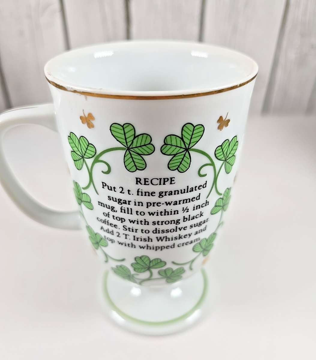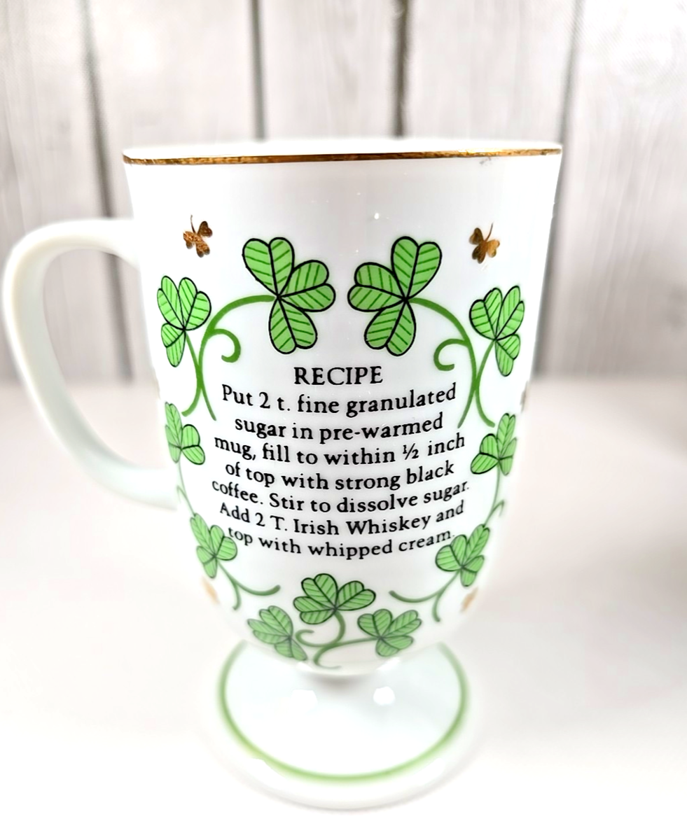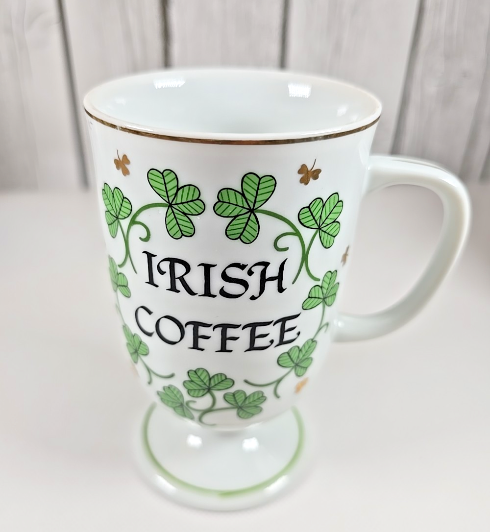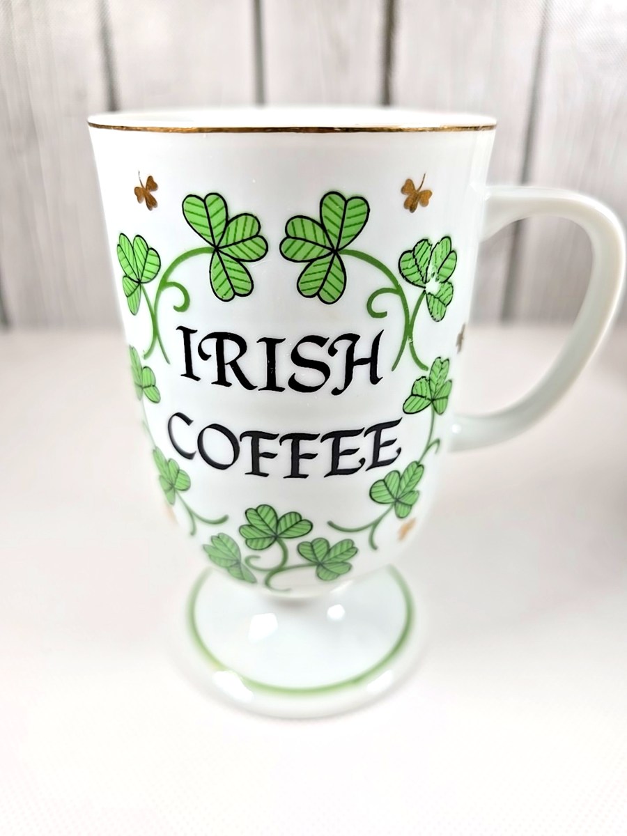 Celebrate timeless Irish charm with this set of 4 vintage 8?oz footed mugs?each adorned with delicate gold trim and shamrock accents, perfect for cozy cafe moments or festive holiday displays. Crafted with elegance and nostalgia, these mugs add a touch of Emerald Isle flair to your coffee hour. ? Four 8?oz footed Irish coffee mugs with gold-rimmed handles and base ? Shamrock motif adds classic St.?Patrick?s charm?ideal for themed gatherings ? Durable glass ceramic blend suitable for hot beverages and display ? Vintage collectible perfect for retro barware, kitchen display, or gift-giving