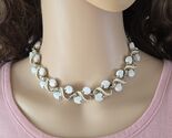 ?Style/Features: This gorgeous vintage choker necklace features a striking mid-century design perfect for a wedding or bridal jewelry look or adding old Hollywood glamour to a cocktail dress or even t-shirt! The linked white lucite cabochons are offset perfectly with bright, sparkling aurora borealis rhinestones (AB rhinestones) in sleek gold tone metal links with cream enamel detailing. This unsigned piece has the classic, desirable style of milk glass or moonglow jewelry form teh 1950s and 1960s. Since it's adjustable down to 12 inches makes a stunning flower girl or younger bridesmaid necklace. It's adjustable length makes it a comfortable retro statement accessory. Ships boxed making a perfect gift for a vintage jewelry collector.