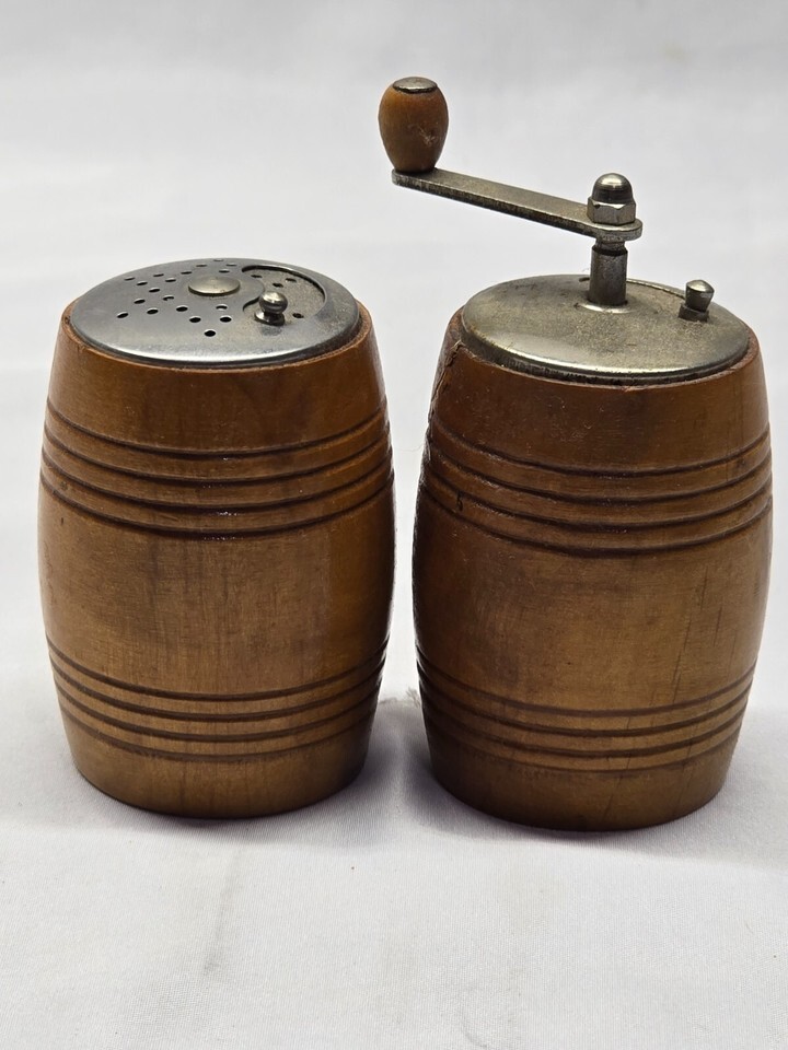 - Vintage Wooden Whiskey Barrels Salt & Pepper Mill Shaker Set - Farmhouse Rustic
