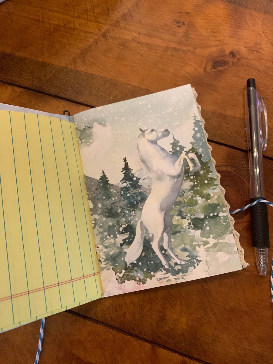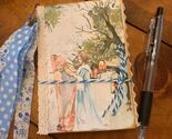 The cover features a watercolor illustration of a woman playing a harp in a garden setting. The journal is tied with a blue and white twine. Comes with several pieces of ephemera. This little journal measures about 3.5? x 5? and is ready for you to add your own imagination. Made from heavy card stock. About 30 pages front/back. This would make a cute little stocking stuffer/gift. May be slightly different from pics.