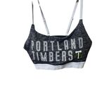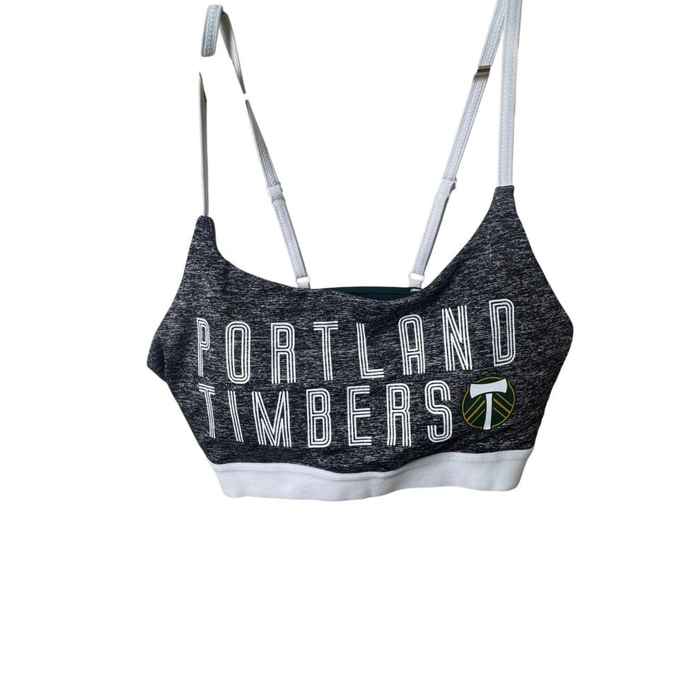 New with tags, stylish activewear in a heather gray color, adorned with the Portland Timbers logo and team name. This bra features a comfortable white band under the bust, and the back showcases a unique strappy design. Adjustable straps ensure a custom fit, making it ideal for light workouts or everyday wear.