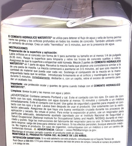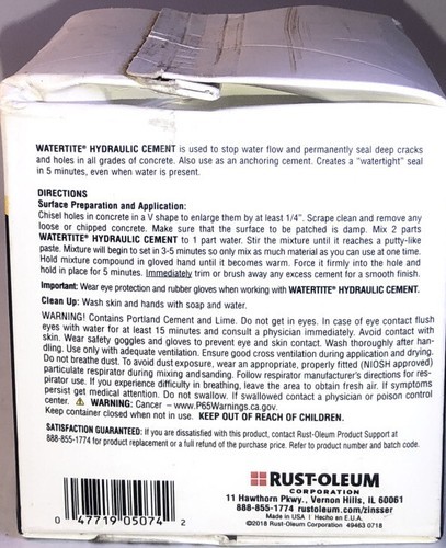 Permanently stop the active flow of water with Zinsser WATERTITE Hydraulic Cement for Concrete and Masonry. This powerful formula adheres to wet surfaces and expands as it dries to fill deep cracks and holes, creating a watertight seal in just five minutes.