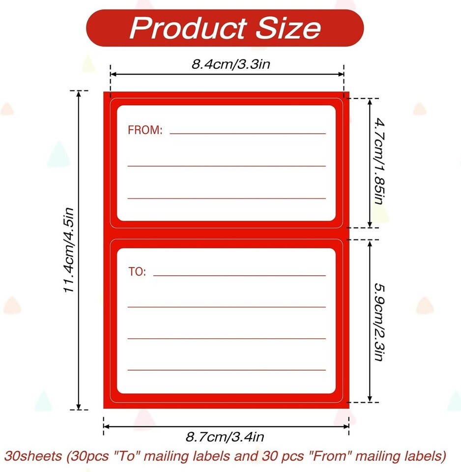 About this item Sufficient Quantity: You will receive 60 mail address labels in 30 sheets, enough shipping Address labels to meet your mailing needs. This to/from label stickers set includes 30pcs "To" mailing labels and 30 pcs "From" mailing labels. Large Size Address Labels: Each return mailing address label measures 11.4 x 8.8 cm/4.5 x 3.5 inches, large enough for you to write down more of your detailed information. Practical Design: Use our mailing address labels personalized stickers in an eye-catching white and red color scheme that allows people to quickly capture the important information on the label. Round corner design makes labels easy to peel off. Adhesive Labels: Our self adhesive return address labels is made of quality material, allowing you to write comfortably and smoothly, and the label is sturdy, not easy to break, and has strong adhesion. Versatile Applications: Not only can these to/from address stickers be applied as mailing boxes address labels, envelope labels, shipping labels, packing labels, electrical panel label, christmas address labels, return address labels, etc.